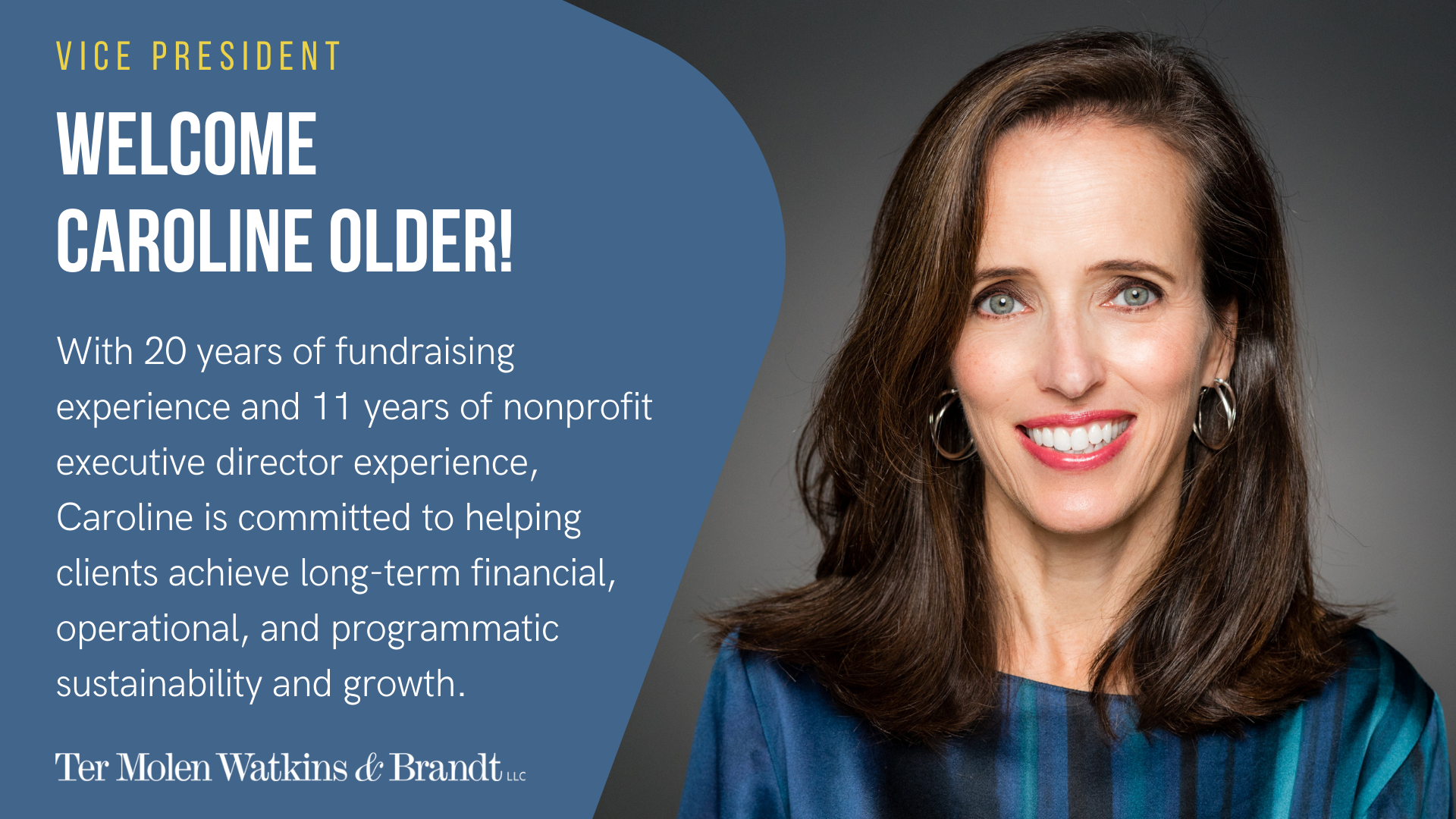 We are pleased to welcome Caroline Older, our new Vice President, to TW&B. To help you learn more about her fundraising and executive leadership expertise, we asked Caroline a few questions.